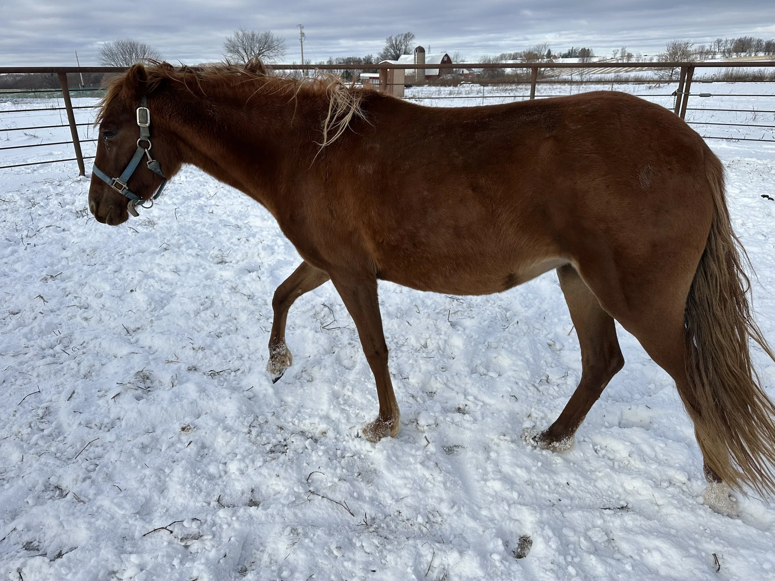 Polly, our steady and patient bay mare, is the leader of the herd and the glue that holds them all together. Her wisdom shines in everything she does, from guiding her herd mates to helping a nervous horse find their footing. Polly’s calm strength is the foundation of the herd’s harmony.